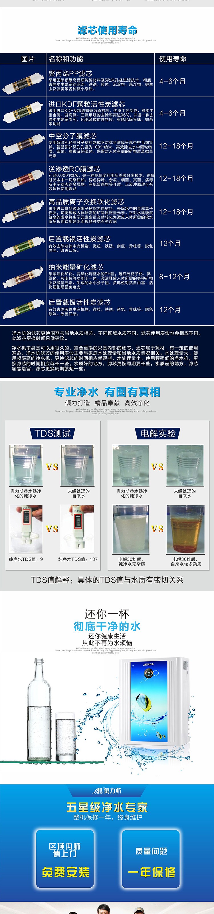 智能芯,節能省電:精選納米遠紅外線礦化球和天然麥飯石,調節水的酸堿度,出水水質為弱堿性,適合人體吸收,促進人體新成代謝,LED電腦板顯示工作狀態,智能濾芯監控系統,實時監控濾芯壽命,換芯亮燈提醒。